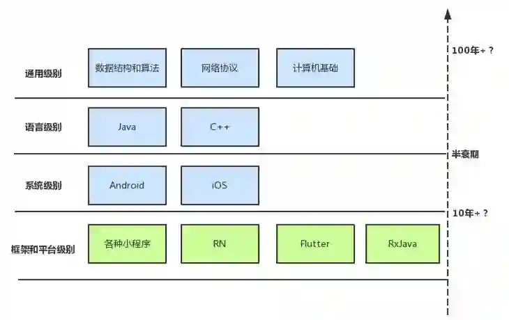上面的半衰期图不完全准确,但是却值得参考,如果你是其他的技术领域也可以参考这个半衰期图。这个图不是告诉我们不要去学RN和小程序,而是结合自身工作尽量学习半衰期长的知识。