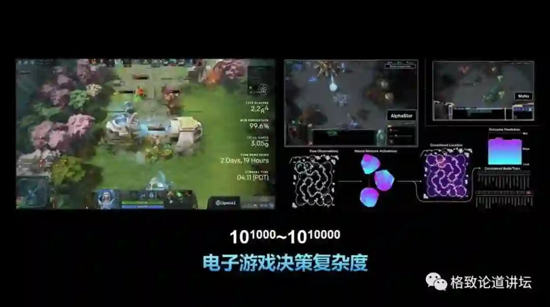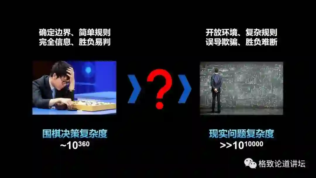 围棋的决策复杂度大概是10360,这样的复杂度已经是目前人类解决的最复杂的决策问题之一了,但它跟现实世界中的决策问题实际还相差甚远。比如一些开放环境下的现实决策问题,复杂度会远远超过1010000。
