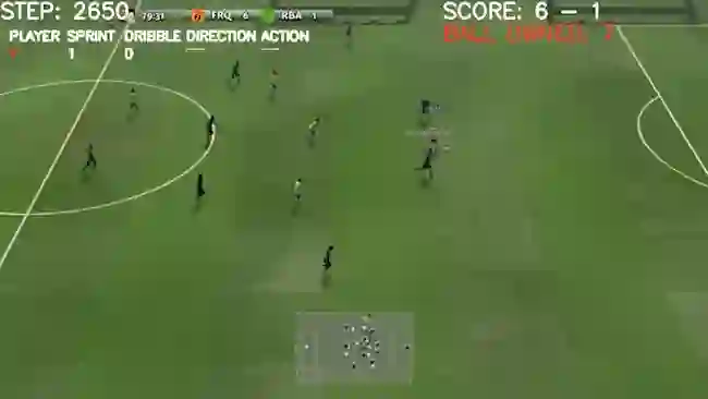 其实现在的AI还只能控制离球最近的这个人,其他的十个人其实都是遵循一些特定的规则去配合他完成的。未来希望能使这11个智能体同时学习,并配合得到更好的结果。