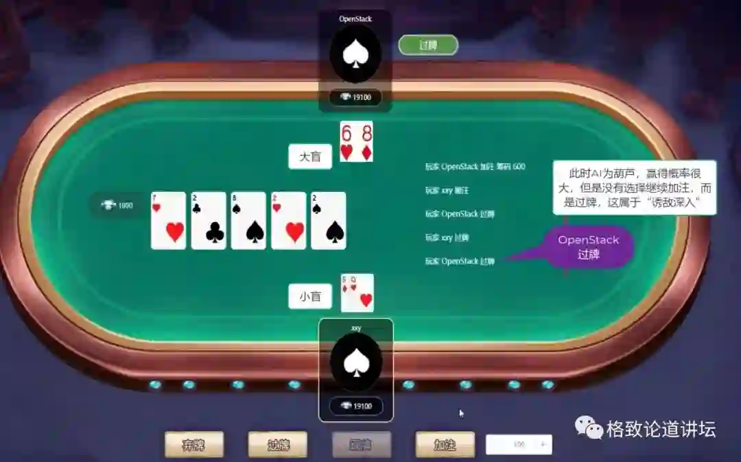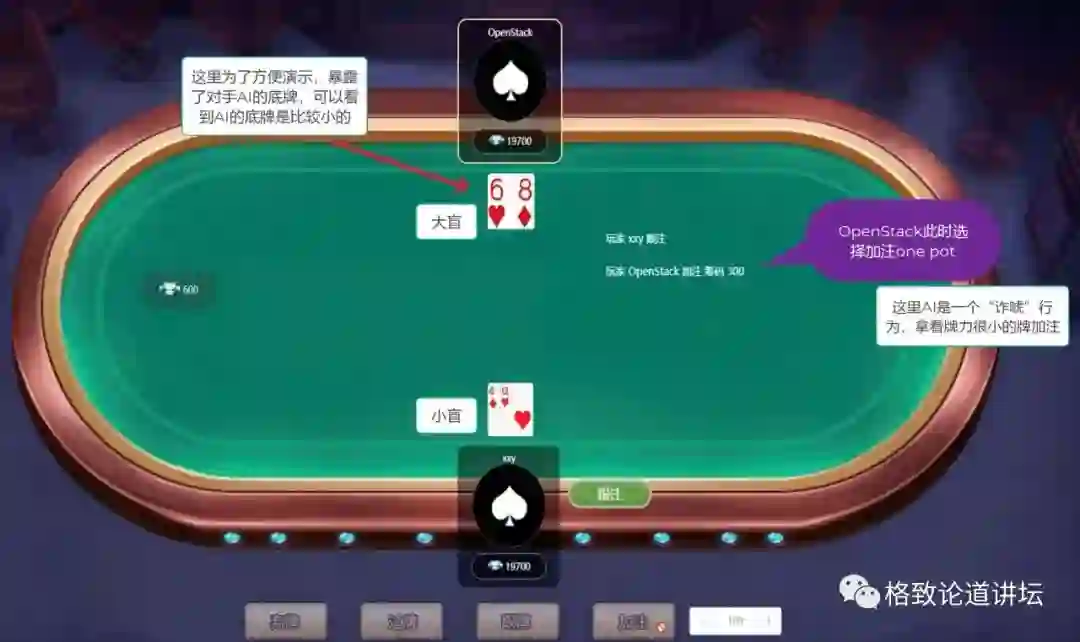 上方的AI拿了不同色的6和8,这两张牌其实非常小。但是它突然押了一个很大的注,这实际上是AI在虚张声势,在德扑里用专业术语叫诈唬,就是想把对方给吓跑。但是对方没有完全被吓跑,跟着走下去了。