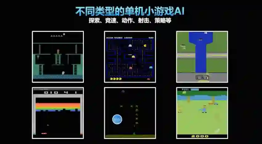 我们首先看看最简单的单机小游戏。大多数这种游戏都来自一个叫雅达利的外国公司,可以说是现代游戏主机的鼻祖。这类游戏有各种各样的类型,包括探索类、竞速类、动作类、射击类、策略类等等。不同的分类能够帮助AI学习不同的能力。