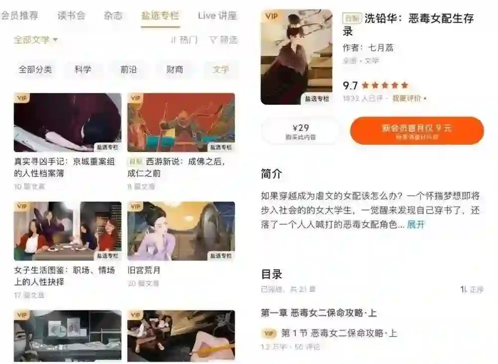 2019年8月,知乎正式将网文业务以“盐选专栏”的形式嵌入在会员体系中。用户付费后,既可以从具体问题下的回答按图索骥找到,也可以直接从会员入口跳转。