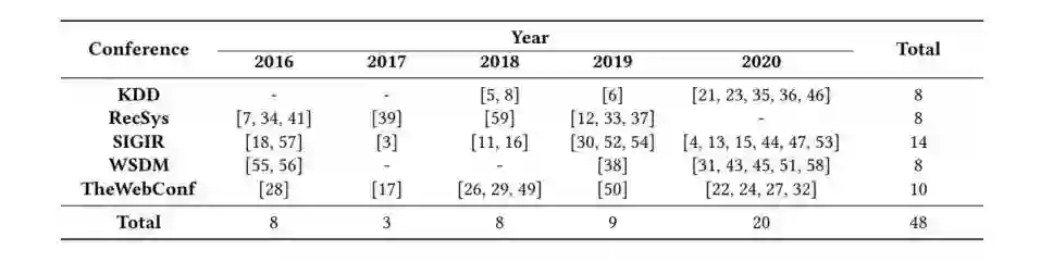 通过对下述5个顶会近5年(2016-2020)年发表的48篇论文进行整理,如下。选择这48篇文章的原则包括:包含关键字“recommend”或者“collaborative”,并且这些论文是针对排序或者分类任务,评价指标为Precision、Recall和nDCG,以及至少使用1个公开数据集。