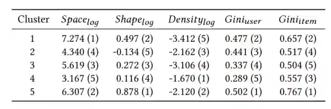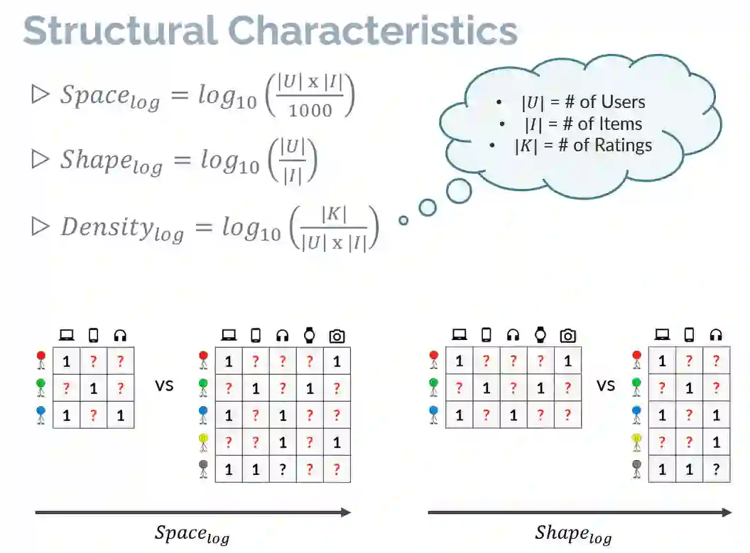 另外,作者还分析了数据集的结构特性(Structural Characteristics),主要反映在空间指标、形状指标以及稠密度指标上。通过下述公式可以看出空间指标反映了用户-物品矩阵空间的大小,形状指标反映了用户与物品的比例,稠密度指标则反映了观测数据相对于所有数据的比例。