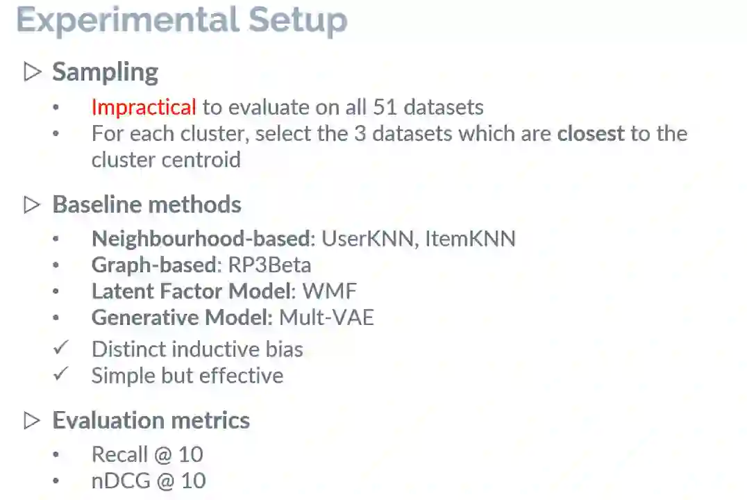 最后,作者选取了5个典型算法(UserKNN、ItemKNN、RP3Beta、WMF以及Mult-VAE)在上述不同的簇中选取了3个数据集进行测试,来探索在不同的簇中测试的推荐效果是否一致。
