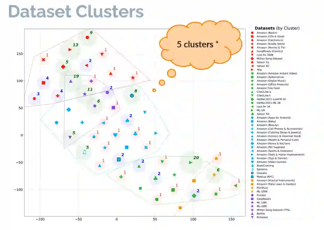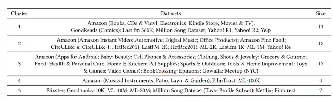 通过实验验证发现,对于不同相似性的数据集,算法的性能排名则不同,比如簇3中最好的算法RP3Beta在簇5中则最差。