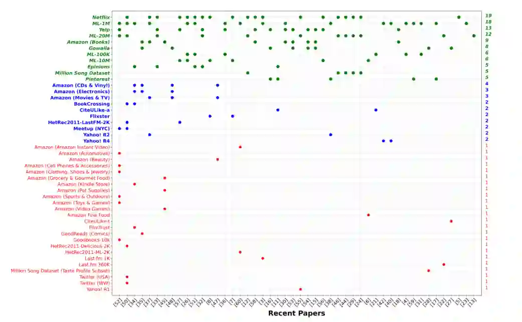 另外,通过利用Apriori算法来对这些论文可能结合的数据集模式进行分析发现,以下数据集组合经常在统一论文中出现,比如ML-20M与Netflix等。另外作者发现,尽管上述论文都解决了基于top-K推荐的隐式反馈问题,但分析表明,数据集的选择往往是任意决定的。即使两篇论文在同一数据集上进行了评价,由于数据预处理或分割策略不同,结果可能不具有可比性。