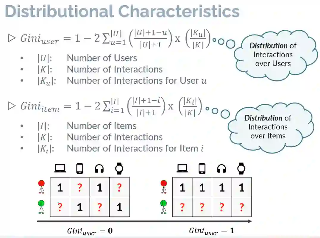 还通过用户侧和物品侧的基尼系数来发现数据集的分布指标。