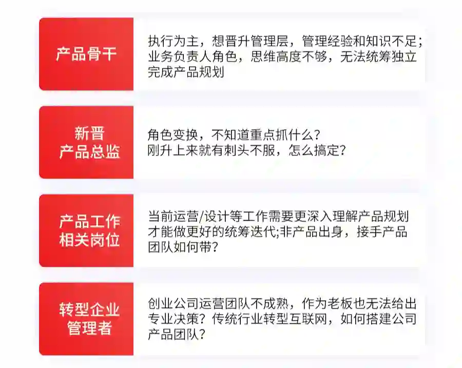 该课程专为工作3年及以上的产品经理/产品骨干量身定制,核心教学目标在于系统提升产品负责人产品规划能力和管理水平。
