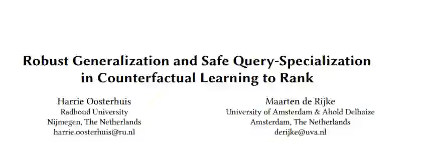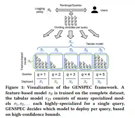 现有的反事实学习排名(LTR)工作集中于优化基于特征的模型,该模型基于文档特征预测最优排名。基于bandit算法的LTR方法通常优化表格模型,这些表格模型记住每个查询的最佳排名。这些类型的模型都有各自的优点和缺点。基于特征的模型在许多查询(包括那些以前未见过的查询)中提供了非常健壮的性能,但是,可用的特征往往限制了模型可以预测的排名。相反,表格模型通过记忆可以收敛于任何可能的排名。然而,记忆非常容易产生噪音,这使得表格模型只有在大量用户交互可用时才可靠。我们能否开发一种稳健的反事实LTR方法,在安全的情况下追求基于记忆的优化? 我们介绍了泛化和专门化(GENSPEC)算法,这是一种鲁棒的基于特征的反事实LTR方法,在安全的情况下,它会对每个查询进行记忆。GENSPEC优化了单个基于特性的模型以实现泛化:跨所有查询的健壮性能,以及用于专门化的许多表模型:每个表模型都针对单个查询优化了高性能。GENSPEC使用新颖的相对高可信度边界来选择每个查询部署哪个模型。通过这样做,GENSPEC成功地实现了专门化表格模型的高性能和基于特征的广义模型的鲁棒性。我们的结果表明,GENSPEC可以在具有足够点击数据的查询上获得最佳性能,而在数据很少或有噪声的查询上具有健壮的行为。