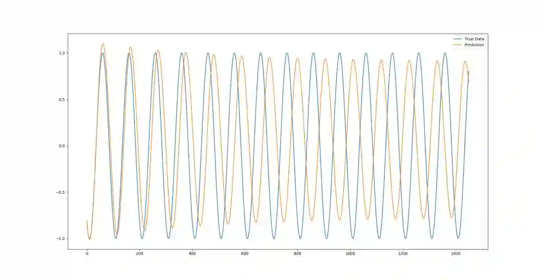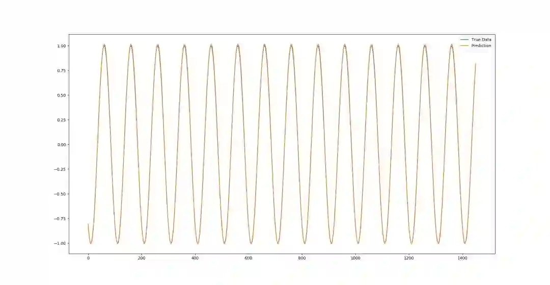 我们可以从上面两幅图中发现,如果用第二种方法进行预测,随着测试集中被不断加入新的预测数据点,模型的性能会渐渐下降,预测结果和真实结果的误差越来越大。但正弦函数是一个非常简单的零噪声震荡函数,总体来看,我们的模型在没有过拟合的同时还是能很好的模型曲线大致情况的。