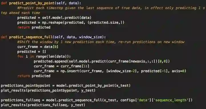对于输出,我们会进行两种类型的预测:一是逐点预测,即先让模型预测单个点的值,在图中绘出位置,然后移动滑动窗口,用完整的测试数据预测下个点的值。二是预测一个完整序列,即只用训练数据的第一部分初始化一次训练窗口,然后就像逐点预测一样,不断移动滑动窗口并预测下一个点。