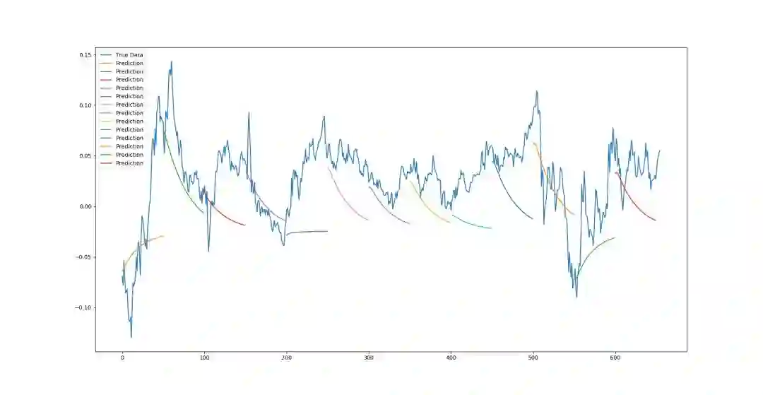 最后,我们对该模型进行了第三种预测,我将其称为多序列预测。这是完整序列预测的混合产物,因为它仍然使用测试数据初始化测试窗口,预测下一个点,然后用下一个点创建一个新窗口。但是,一旦输入窗口完全由过去预测点组成,它就会停止,向前移动一个完整的窗口长度,用真实的测试数据重置窗口,然后再次启动该过程。