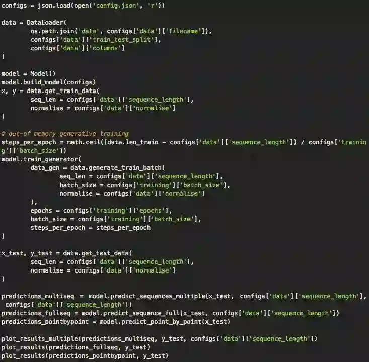 处理完数据后,我们就可以和之前一样运行模型。但是,我们做了一个重要的修改:不使用model.train() ,而是用model.traingenerator()。这样做是为了在处理大型数据集时节约内存,前者会把完整数据集全部加载到内存中,然后一个窗口一个窗口归一化,容易内存溢出。此外,我们还调用了Keras的fitgenerator()函数,用python生成器动态训练数据集来绘制数据,进一步降低内存负担。