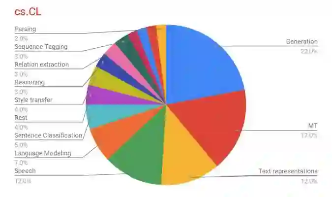 图 1:cs.CL 领域 top-100 论文的任务分布情况。我们可以从中观察到自然语言生成任务是其中的主导任务。