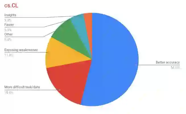 图 3:cs.CL 领域 top-100 论文的目标分布情况。我们可以从中看到超半数研究的目标是提高准确率。
