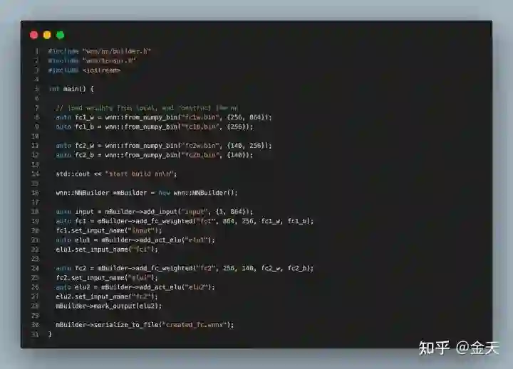 我在做这套IR的时候,猛然发现它的功效其实还可以做很多事情,不仅仅是学习,甚至可以完成一些工业落地的东西。介绍一种模型部署新思路:我们有没有一种可能,直接用推理框架来构建模型?答案是完全可以的。直接上代码: