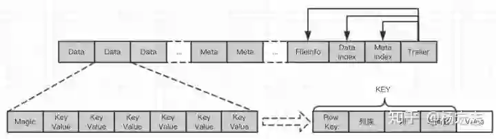 DataIndex存储Data块的索引信息:Data存储为一组磁盘块,存储数据信息;DataIndex功能类似于B+树的非叶子节点;Data每个磁盘块中的数据按key有序,加载到内存后可以用二分查找定位;Key按行 + 列族 + 列 + 时间戳生成,按字典序排序(最佳查询方式:最左匹配);