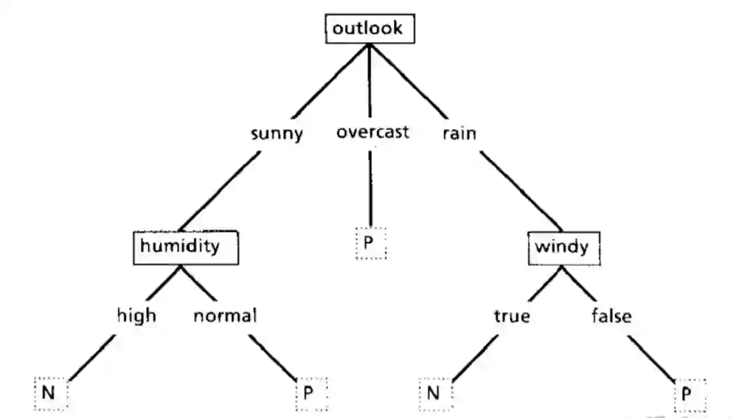 可以发现 Outlook 的信息增益最大,优先在这个特征上划分,在递归到其他特征上最终形成的决策树图如下: