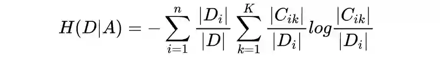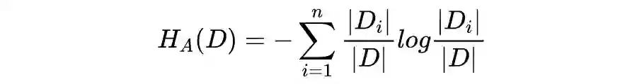 2)选择用样本的某一个特征 A 来划分样本集合 D 时,就可以得出特征 A 对样本 D 划分所带来的信息增益。特征 A 把 D 划分为 n 个子集,计算特征 A 对数据集 D 的条件熵 H(D|A):