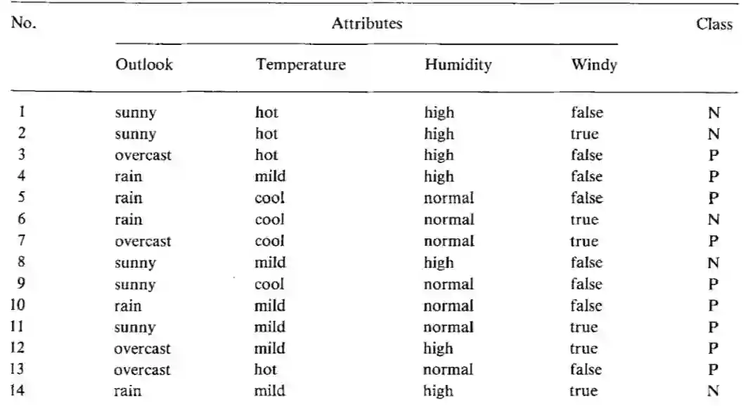 假设有两个分类,一个是 N,一个是 P,Outlook 表示天气情况,Temperature 表示气温情况,Humidity 表示湿度,Windy 表示有风,这四个作为特征,每个特征下面的离散值作为特征值。那么数据的熵