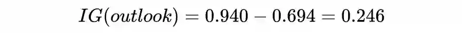 当一个特征已经作为划分的依据,在下面递归过程就不在参与了。经过根结点下面特征各个取值后样本又可以按照相应特征值进行划分,并且在当前的样本下利用剩下的特征再次计算信息增益来进一步选择划分的结点,ID3 决策树就是这样建立起来的。
