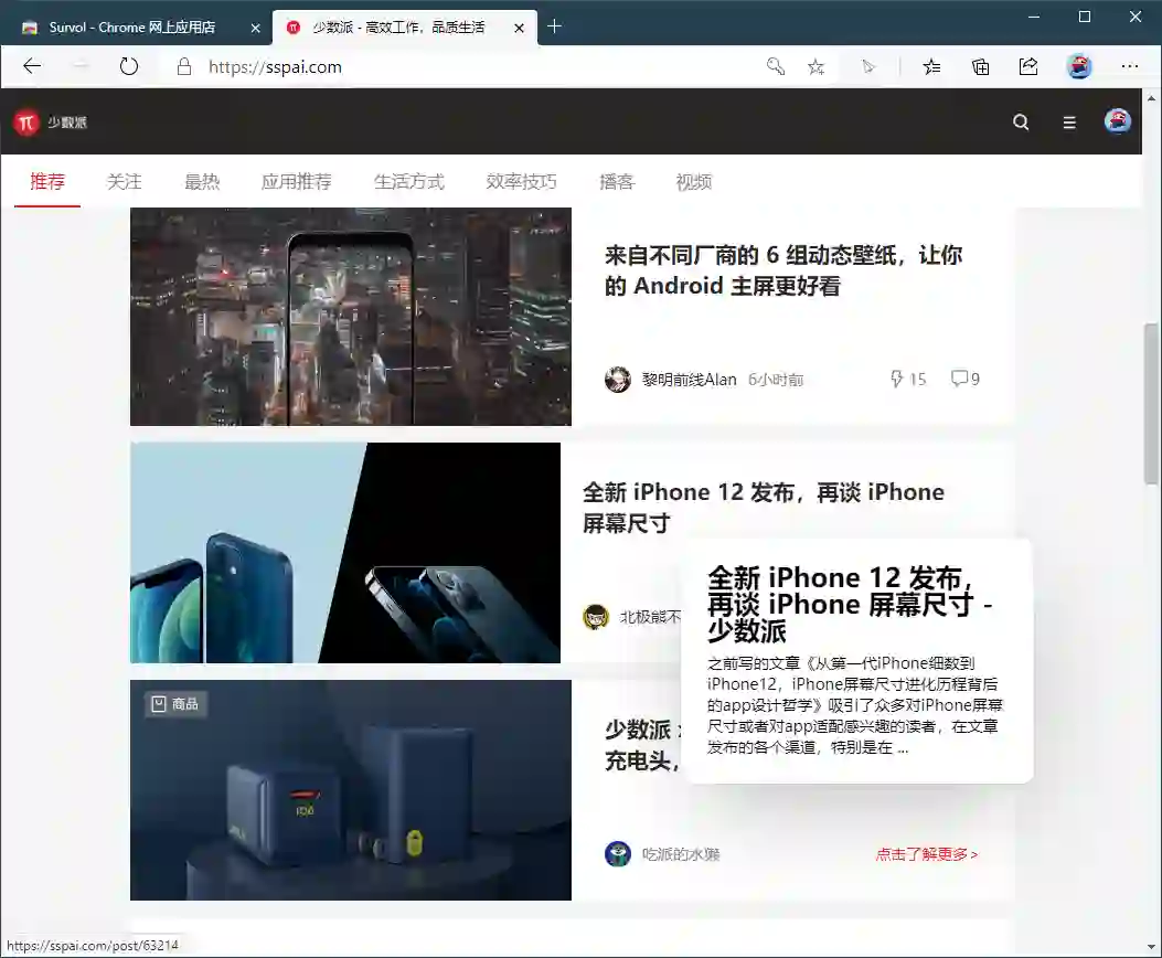 Survol 是一款非常小巧的链接预览插件,安装后你可以将其隐藏到菜单里面。当光标移动到链接上面时,旁边会弹出一个窗口来展示链接指向页面的描述,其内容则是提取来自 HTML 的 meta 标签。meta 标签中的描述一般是文章作者自己对该文的简要介绍,好的简介可以大致了解文章主旨,我们就可以决定要不要继续阅读这篇文章了。