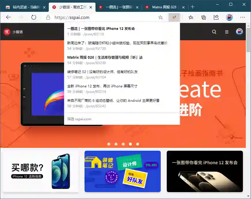 来试试 Fiteprint 吧,它可以基于当前站点向用户展示历史记录,省略了我们进入设置再打字搜索的步骤,其中已经开启的标签页则加粗显示便于确认。如果当前页面是个新标签页,那么 Fiteprint 则会在小窗口中依次展示所有历史记录,对于查看近期浏览历史比较有用。