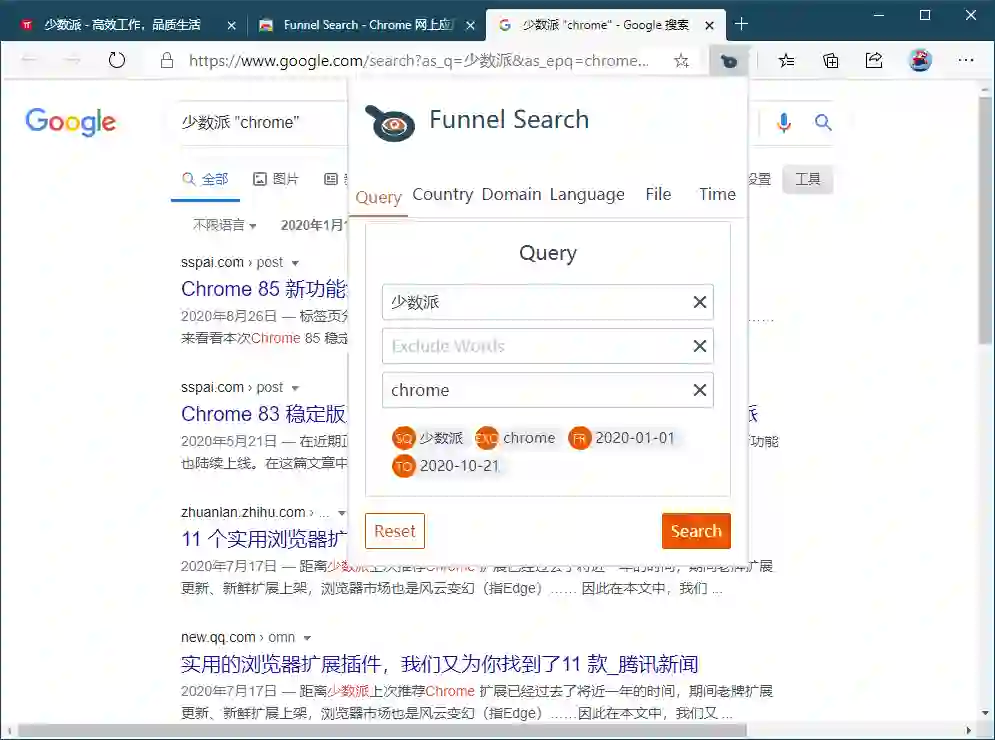搜索引擎有许多高级语法,比如使用「site」标签搜索特定网站、「filetype」标签搜索特定文件类型等等。有时候我们大脑宕机想不起来了,或者压根就记不住这么多语法,可以试一下这款 Funnel Search 插件。
