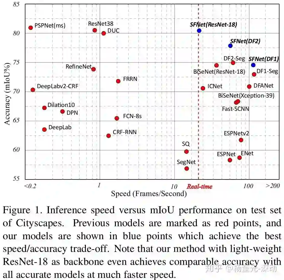 该方法的优势是既快又准,如下图所示,ResNet18 backbone以26 FPS速度取得了80.4 mIoU。