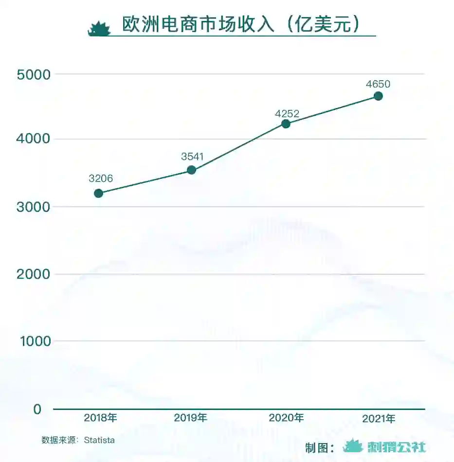 同样的趋势也发生在欧洲各国。疫情暴发前的2019年,欧洲电商总收入为3541亿美元,到2021年底,这个数字涨到4659亿美元,两年间涨幅超过30%。