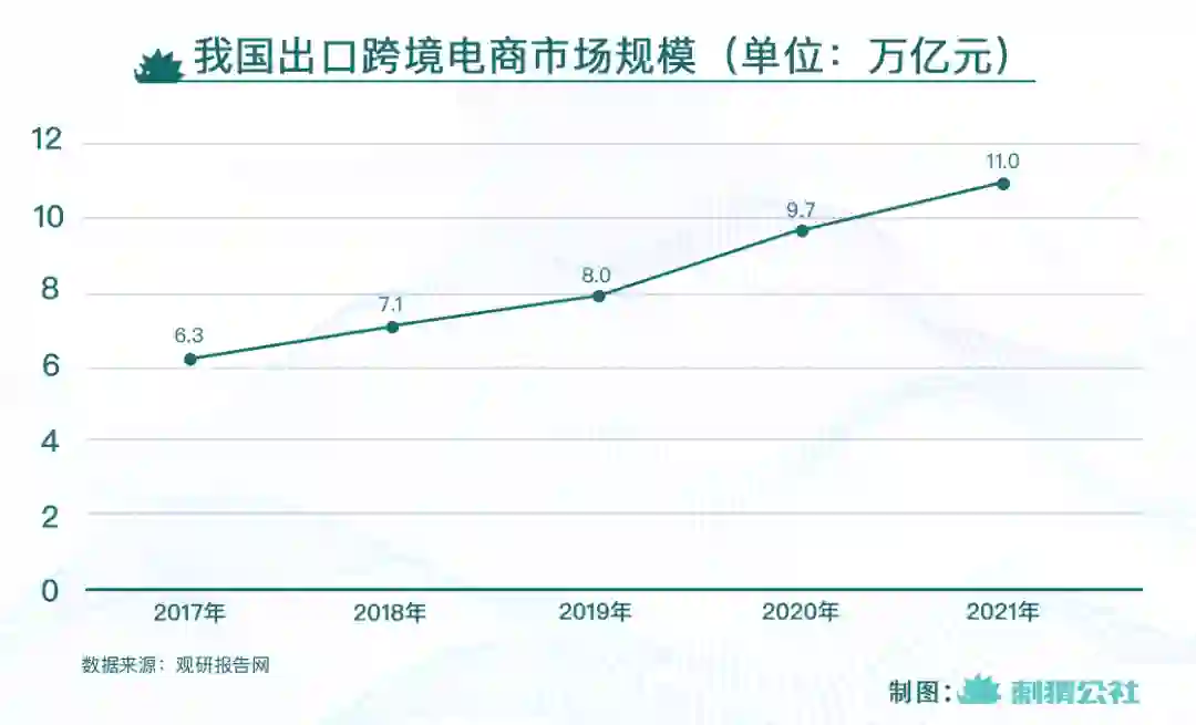 根据招商证券相关报告,2020年,中国跨境电商在外贸中的渗透率已高达39%,且在海外线上消费高速发展的驱动下,跨境电商对出口业务的贡献度逐年攀升。根据观研报告网相关数据,从2017年到2021年,我国出口跨境电商市场规模实现翻倍,其中疫情初期的2020年,增速高达20.79%。