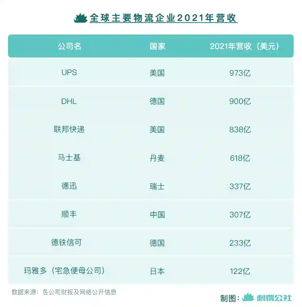 2021年,顺丰凭借307亿美元的总营收跻身全球物流公司营收前列。在它身前,UPS、DHL、联邦快递都是老牌快递巨头,在北美和欧洲市场有较强的统治力,马士基是全球最大的集装箱航运公司,德迅则是全球最大的海运代理公司。——在被疫情加速的线上消费浪潮下,这些物流公司各自取得高速业绩增长。而今年,顺丰有望凭借增速强劲的国际化业务冲击更靠前的位次。