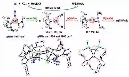 研究发现,零价钴分子氮配合物[(ICy)3Co(0)(N2)]经碱金属还原可以得到负一价钴双(分子氮)配合物M[(ICy)2Co(-1)(N2)2](M = K,Rb,Cs)。这些负一价钴双(分子氮)配合物中的氮气分子在质子酸的作用下可以部分选择性地转化为肼,产率为24%-30%(相对于钴);与R3SiCl(R = Me,Et)反应,可以实现氮气分子的1,2-二硅化,形成钴二氮烯配合物[(ICy)2Co(II)(ƞ2-R3SiNNSiR3)],这是首例由氮气分子官能化直接制备的后过渡金属二氮烯类配合物。在还原剂KC8和Me3SiCl存在下,配合物[(ICy)2Co(II)(ƞ2-Me3SiNNSiMe3)]中的含氮基团可以高产率地转化为N(SiMe3)3。在此基础上,课题组进一步发展了氮杂环卡宾钴配合物催化的氮气分子的还原硅化反应,TON值达120,超过了目前已报道的3d金属催化体系。该研究拓展了后过渡金属在氮气活化转化方面的应用,对新的后过渡金属催化体系的设计具有指导意义。