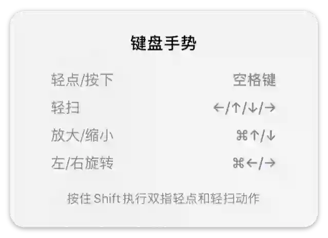 在「键盘手势」模式里,你的方向键也变成了朝四个方向滑动屏幕的手势。而 Command + 方向键则对应着放大缩小以及旋转的操作。如果你想要用双指点按或滑动屏幕,只需要按住 Shift 键,再点击空格或方向键即可。