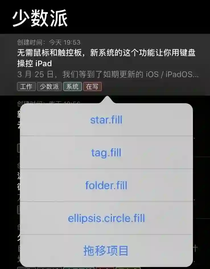 以 Ulysses 为例,尽管应用对 VoiceOver 和「全键盘控制」的适配良好,但在一些细节处依然没处理到位。比如文章列表左滑菜单中的各项操作,通过 Tab + Z 展开的菜单就只能显示其占位符的名称,而在 VoiceOver 里,这三个图标的名称也如菜单中一样,没有进行适配。