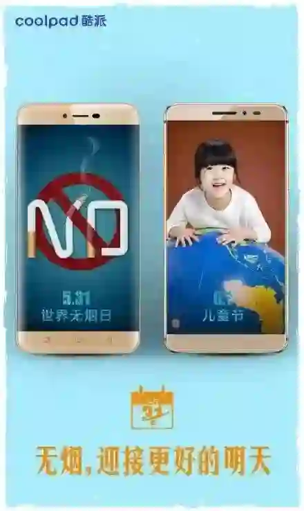 酷派手机则与六一儿童节联动,将禁烟标识与孩童的照片用产品展示,以便迎接更好的明天。