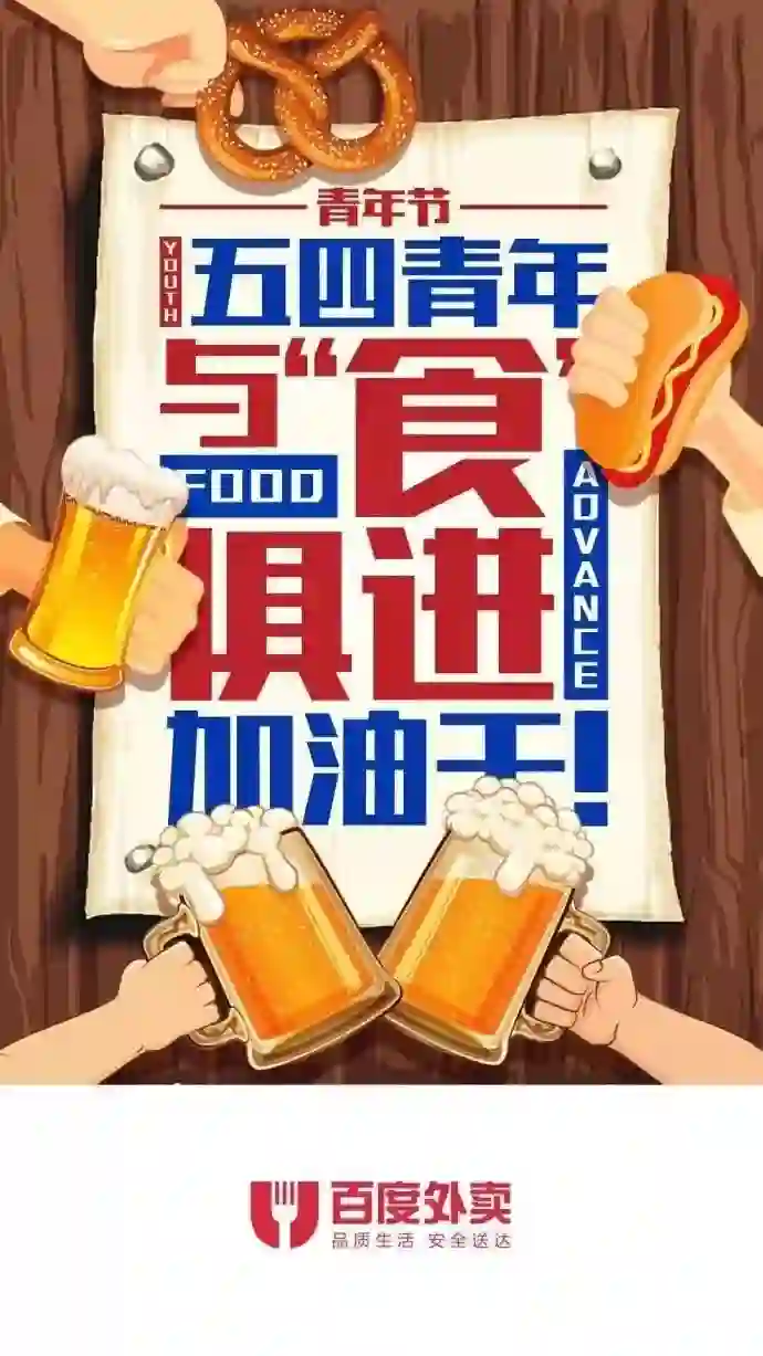 宣传文案中使用“谐音梗”容易给人留下印象,比如百度外卖在宣传海报中的文案就玩了一把“谐音梗”,“五四青年 与食俱进 加油干”,朗朗上口,趣味十足。但小派得提醒大家,玩梗得适度,不然一不小心就翻车了。