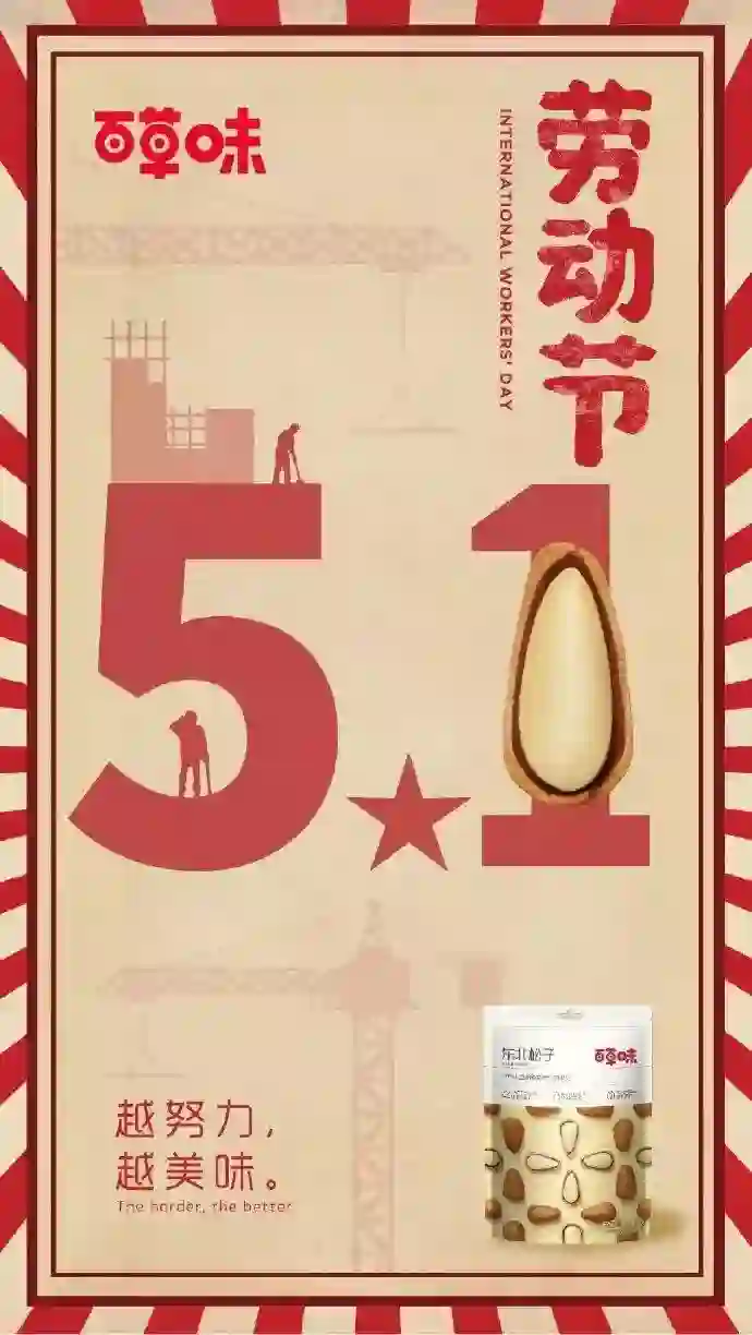 百草味把劳动者的精神特质与品牌名称相结合,“越努力,越美味”一语双关。