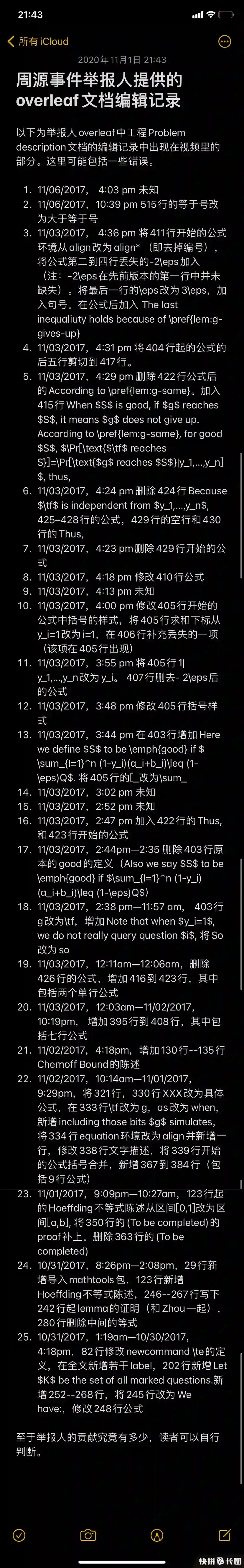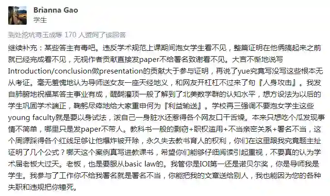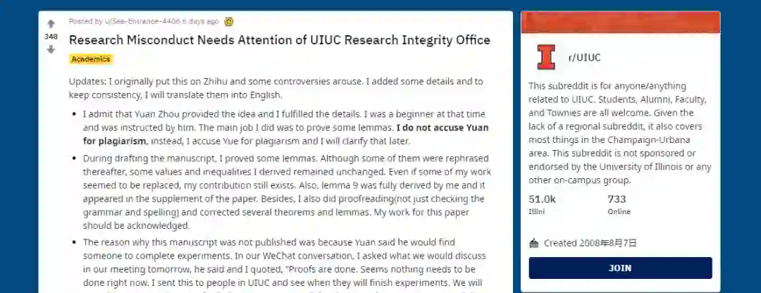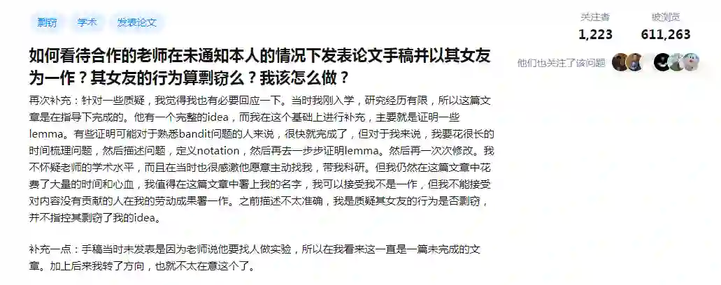 题主在帖子中曾提到,Ta希望:1、Yuan Zhou向其道歉,因为他不尊重Ta的工作(无论工作是大是小);2、Yuan Zhou肯定Ta的工作,将Ta的名字加入论文作者名单或在致谢部分肯定Ta的贡献,由专家裁定;3、如果没有清晰的证据证明Yue对论文的贡献,应将Yue从论文作者名单中除名;如果Yue被列为该论文的一作,她应说明自己对论文的贡献大于题主;4、如果第2点与第3点要求无法满足,则应撤回该论文。尽管质疑声四起,但支持题主维权的声音也蜂拥而至。网友@Briana Gao抨击了Yifan等人的言论。在他看来,周源及其女友踩了多条红线:剽窃、职权滥用、不当亲密关系、署名不当:此外,将论文送给没有参与研究的女友,无疑会让人觉得女性科研者可以凭借两性关系、而非自己的科研实力获得学术成就,对全体女性科研者的声誉产生了破坏。至于题主对论文的贡献,网友@真实和永恒等人提到:1)无论题主的编辑记录是否trivial,只要有权利在Overleaf里写东西,都可以作为co-author;2)曾一起讨论、做题,并取得了明确的结果,便默认是合作者;3)借助了Prof Jeff Erickson的话:Ideas are cheap, what matters is who did the actual work. (点子不重要,重要的是谁做了实际的工作。)尽管知乎与Reddit上热议不断,但相关部门仍未给出回应,周源及其女友也没有作出任何回应。换言之,事实的真相仍不可得知。大家怎么看?