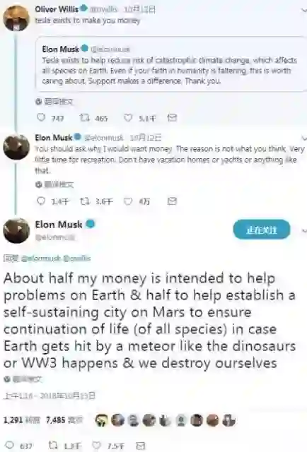 如图所示,他先谈到,特斯拉存在的目的是为了减少气候变化的风险,加速全球向可持续能源的转变。然后,有网友质疑他成立特斯拉就是为了赚钱。他则回应,网友应该问他为什么想赚钱。他进而表示,自己很少有时间娱乐,也没有度假屋,游艇之类的东西。