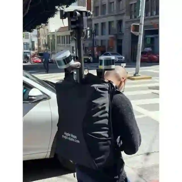 徒步拍摄街景的工作人员背着一个大背包,上面印有“苹果地图”字样,背包上方树立着很多摄像头。这些装备与苹果街景车上使用的设备差不多,包括摄像头、GPS和激光雷达。