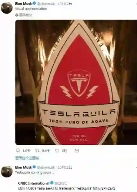 如图所示,美国财经媒体CNBC报道了相关新闻,马斯克转发并表示马上就会开售。马斯克还发了一个特斯拉牌龙舌兰的样品,容量是750ML。