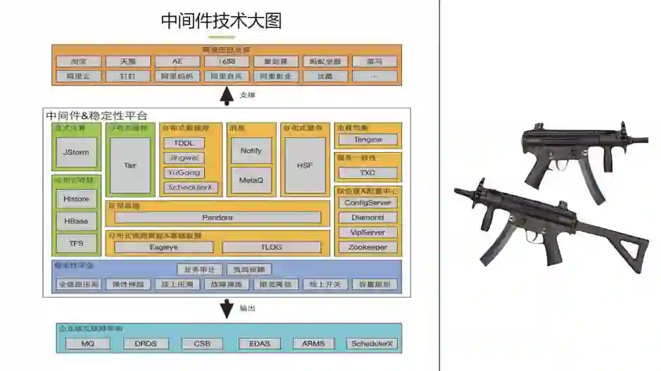 如果将业务数据双中台比喻成强大的中台炮火群,可以直接对敌人进行进攻。那技术中台的作用就有些间接,有点像前台特种兵身上各种先进的武器装备。精良易用的武器装备,可以在大幅缩短前台特种兵的建设周期的同时大幅提高单兵作战能力,令敌人胆寒。