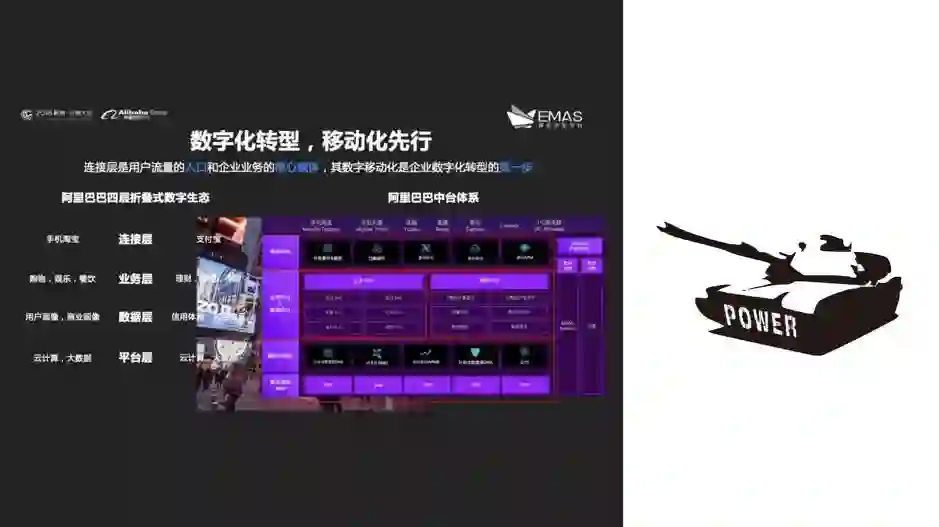 移动中台建立在业务数据双中台之上,更靠近移动前端战场,我们可以类比成战场上的坦克群,近距离支撑一线战场。