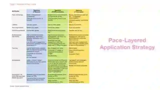 对于这样的问题,Gatner在2016年提出的一份《Pace-Layered Application Strategy》报告中,给出了一种解决方案,即按照“步速”将企业的应用系统划分为三个层次(正好契合前中后台的三个层次),不同的层次采用完全不同的策略。