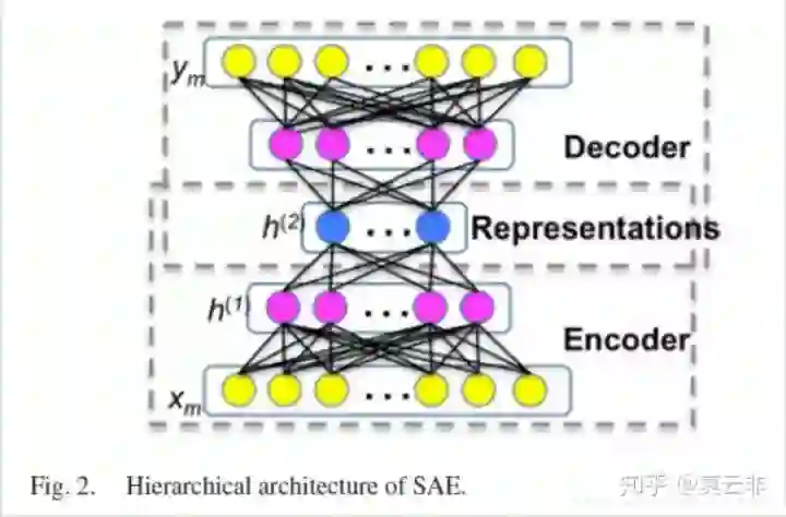 上图是SAE网络,蓝色的部分就是我们想要的特征向量。我们训练该网络希望该网络的输出ym与网络输入xm尽量相似。