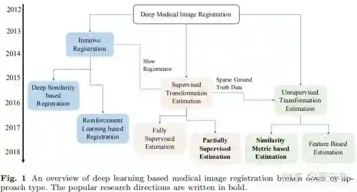 这里笔者尝试解读一篇2019年预发表的《Deep Learning in Medical Image Registration: A Survey》论文综述,在这篇综述中,原作者对当前深度学习在医学影像配准中的各个研究方向做了比较系统全面的总结概括,既有纵向的近十多年来研究趋势的总结,也是横向的各个研究方向的对比。尽管可能存在解读不够深入,文献选择不够典型等问题,但对于刚入坑的萌新来说,应该算是一篇不错的入门论文。