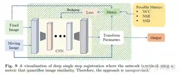 这是最早的将深度学习应用于医学图像配准的研究。基本的配准思想还是传统的那些,只是在传统方法中嵌入了神经网络用来提取特征,或者学习相似性测度等。与其他两种方法的最直观的区别在于这种方法每配准一对图像都要迭代优化去寻找最优解。