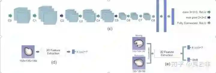 上图是三维图像块做姿态估计的网络架构。分为两步,第一步是估计出三维图像块的旋转角度(相对canonical坐标系),可视为粗配准,loss采用的常见的MSE。第二步是精细配准,将上一步得到的粗配准后的图像和参考图像输入网络,得到最终的变换参数(3个旋转参数,3个平移参数)。平移参数的loss依然是MSE,旋转参数的是geodesic loss。由于这篇论文的任务是姿态估计,并不是任意两张图像的配准,所以网络的输入一般是单幅图像,这里第二步输入了参考图像,这里的参考图像是通过梯度中心匹配算法计算出来的。
